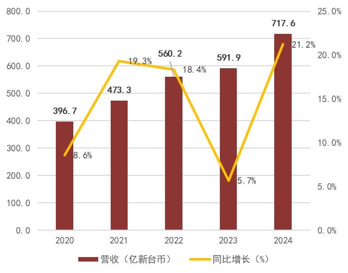 表 1:奇鋐科技 2020—2024 年?duì)I收(億新臺(tái)幣)及 增速(%)
